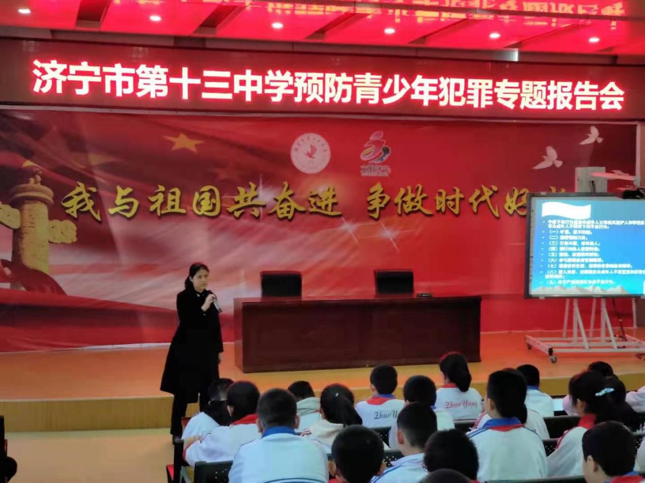 在疫情来临之前,为配合中学生法制教育工作,受济宁市十三中级部邀请,圣和律师组成四人宣讲团队,根据未成年人的成长接受能力及兴趣特点,通过青少年常见常发涉及故意伤害、抢夺抢劫、高空抛物等各类实际案例,制作了相应的漫画图片结合文字说明法律课件,并分工讲解,给孩子们做了一场生动的预防青少年犯罪专题报告会。使孩子们在听讲法律故事的过程中,自我发现身边的安全隐患,学会用法律约束自我,保护自己。该活动取得较为满意的教育效果,受到学校领导及片区警务人员的一致好评。