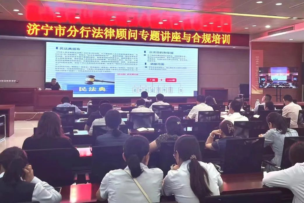 为提高银行工作人员的风险法律意识,树立员工的法治观念,坚持依法合规经营,2023年8月9日,山东公明政和律师事务所金融团队受邀为中国邮政储蓄银行股份有限公司济宁市分行开展了专题法律讲座。济宁市分行各部门百余人现场参加了本次培训,此外,济宁分行下辖各县市区支行人员通过线上方式参与本次专题培训。